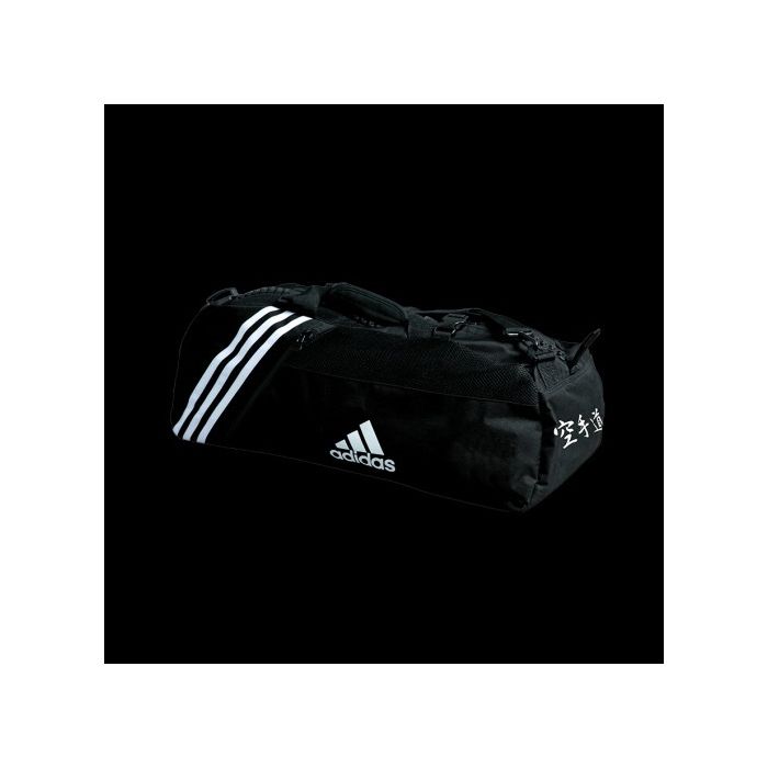 In black heavy coated polyester parachute material with mesh sides and nylon strap with single shoulder cushion on top and double shoulder cushion on bottom. “Big Fly” plastic easy running large zipper top closing. Converts into a rugged backpack.